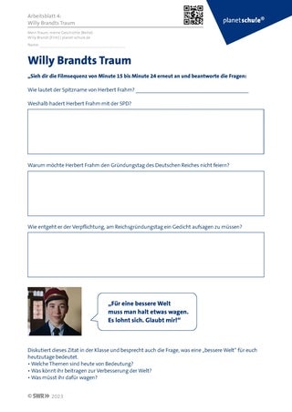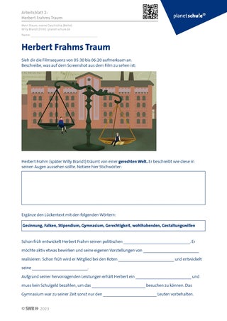 Auf Arbeitsblatt 2 wird Herbert Frahms Traum von einer gerechten Welt benannt und erläutert. Es bietet sich an, nach der Bearbeitung von Arbeitsblatt 2 erneut auf die Träume der Schüler:innen zurückzukommen und diese mit dem Traum von Herbert Frahm zu vergleichen.