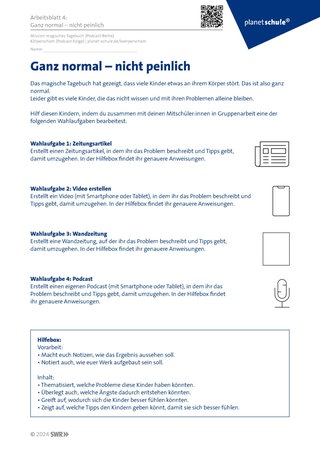 Zuletzt wird das Arbeitsblatt 4 (Sorgen um den eigenen Körper) ausgeteilt und die Schüler:innen bearbeiten in Gruppen eine der vier Wahlaufgaben. Die Ergebnisse werden danach der Klasse präsentiert.