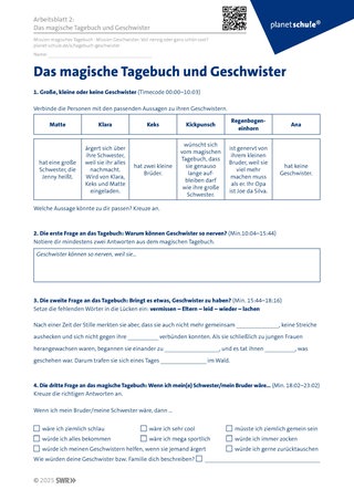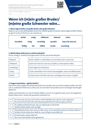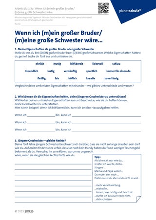 Die Schüler:innen der Klasse 5 erhalten Arbeitsblatt 3a. Für die Klassenstufe 3 und 4 empfiehlt es sich das differenzierte Arbeitsblatt 3b zu bearbeiten. Die Schüler:innen sollen sich in die Lage des älteren Geschwisterteils hineinversetzen und sich so im Perspektivwechsel üben.