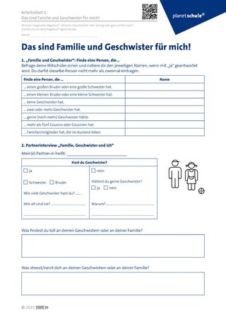 Die Schüler:innen erhalten Arbeitsblatt 1 und informieren sich mithilfe Aufgabe 1, „Finde eine Person, die …“, über Geschwister und Familie ihrer Mitschüler:innen. Mithilfe der Fragen in Aufgabe 2, „Partnerinterview“, stellen sie einem/r ausgewählten Partner:in konkretere Fragen über ihre Geschwister und Familie.