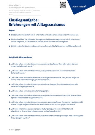 Einstiegsaufgabe: Alle Schüler:innen stellen sich an der Wand im Klassenzimmer auf. Es werden Alltagsrassismus-Situationen vorgelesen wie „Hat dir schon jemand Charaktereigenschaften bezüglich deiner Herkunft zugeschrieben? z.B.: du als Deutscher bist sicher immer pünktlich. Wenn der Schüler oder die Schülerin dies mit „Ja“ beantwortet, geht er/sie einen Schritt nach vorne. So kann man erkennen, wie viele Rassismus-Erfahrungen die Schüler haben. (Materialblatt 1: Einstiegsaufgabe – Erfahrungen mit Alltagsrassismus)