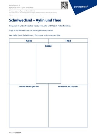 Im Podcast lernen die Schüler:innen Aylin und Theo kennen. Auf Arbeitsblatt 1 (Schulwechsel – Aylin und Theo) sollen sie alle Infos, die sie beim Anhören des kompletten Podcasts erhalten haben, stichwortartig zusammentragen. Dann sollen sie sich die Kinder vorstellen und zeichnen.