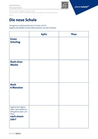 Auf Arbeitsblatt 4 (Die neue Schule) tragen die Schüler:innen Informationen aus dem Podcast zusammen, bezüglich Aylins und Theos Erfahrungen in den neuen Schulen. Diese werden um Vermutungen der Schüler:innen ergänzt.