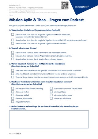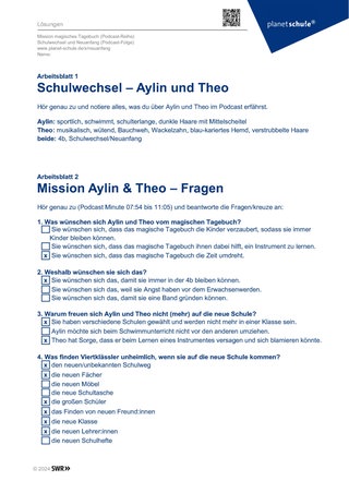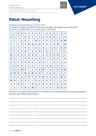 Die Arbeitsblätter 2 und 3 widmen sich der Mission der beiden Freund:innen. Auf Arbeitsblatt 2 (Mission Aylin & Theo – Fragen zum Podcast) geht es darum, sich die Problematik der Viertklässler bewusst zu machen und auf Arbeitsblatt 3 (Rätsel: Neuanfang) werden Hilfsmittel erarbeitet, die einen Neuanfang erleichtern können.