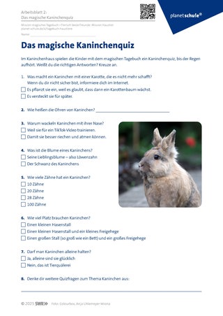Die Lehrkraft spielt der Klasse den Podcast bis zum Ende vor. Anschließend bearbeiten die Schüler:innen Arbeitsblatt 2 – das „Magische Kaninchenquiz“ und Arbeitsblatt 3, den Haustier-Steckbrief. Je nach zeitlicher Möglichkeit eignet sich Arbeitsblatt 3 auch gut dazu, als Hausaufgabe bearbeitet oder beendet zu werden.