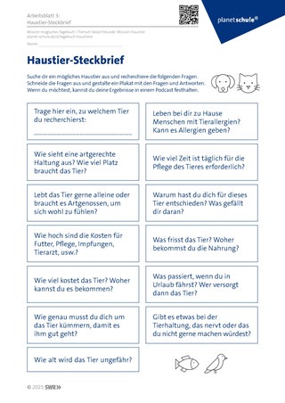 Die Lehrkraft spielt der Klasse den Podcast bis Min.14:10 vor. Anschließend bekommen die Schüler:innen Arbeitsblatt 1 „Samiras Mission“, auf welchem sie reflektieren, welche schönen und auch nervenden Begebenheiten der Besitz eines Haustieres mit sich bringt.