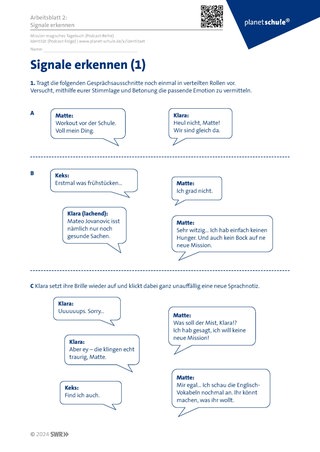 Bearbeitung Arbeitsblatt 2, Seite 1 (Signale erkennen). Zur Sicherung spielen zwei Gruppen die Dialoge im Plenum vor, die Mitschüler:innen geben Rückmeldung.
