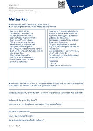 Podcast gemeinsam von 5: 50 bis 10:53 anhören, anschließend Bearbeitung von Arbeitsblatt 3 (Mattes Rap). Aufgabe 3 können die Schüler:innen zuerst mit ihrem Sitznachbarn oder in Kleingruppen bis vier Personen besprechen (Think-Pair-Share)