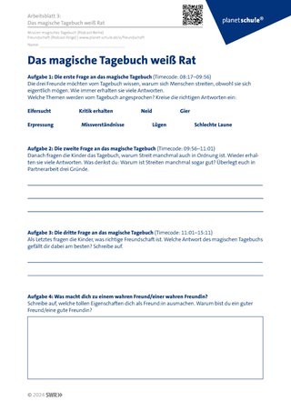 Material: Podcast, Abspielgerät, Arbeitsblatt 3: Das magische Tagebuch weiß Rat