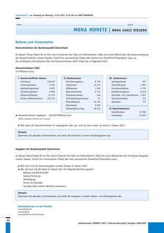 Die einzelnen Referate behandeln die Themen, die auch im Film angesprochen werden: Staatseinnahmen Staatsausgaben Je nach Alter und Leistungsfähigkeit der Schüler kann der Lehrer hier recht einfache Referate zu bestimmten Sachverhalten bis hin zu komplexen Erklärungen vielfältiger Zusammenhänge in Auftrag geben. Die Arbeitsblätter sind daher recht offen formuliert und sollten entsprechend angepasst werden.