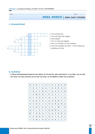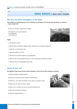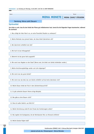 Mit ihrer Hilfe ist es möglich, verschiedene Aspekte des Filmes zu erarbeiten: vom rein Inhaltlichen über den Verlauf bis hin zum Referieren über spezielle Themen. Die Folge „Mona zahlt Steuern“ beinhaltet vielfältige weiterführende Informationen zu verschiedenen Aspekten innerhalb des Themas „Steuern“.