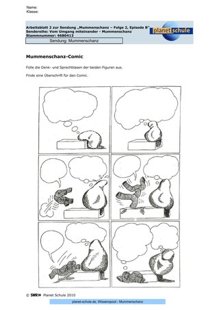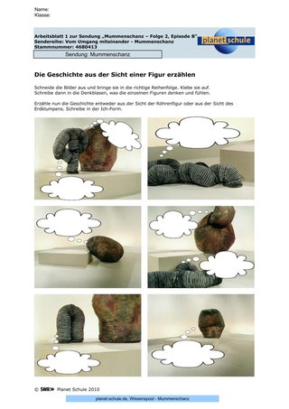 Die auf den Bildern dargestellten Figuren sind mit Denkblasen versehen. Um sich in die Charaktere hineinzuversetzen sowie Nonverbales zu versprachlichen, erhalten die Schüler die Aufgabe, Gedanken und Gefühle der beiden Figuren in die Denkblasen zu notieren. In Partnerarbeit tragen sich die Schüler ihre Ergebnisse gegenseitig vor und besprechen diese. Nach diesen Vorübungen zur eigentlichen Schreibaufgabe entscheiden sich die Schüler für eine Perspektive und schreiben die Geschichte entweder aus der Sicht des Erdklumpens oder der Röhrenfigur.