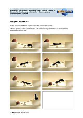 Am Ende dieser Episode stellt sich die Frage über den Fortgang der Geschichte: Was passiert mit dem Sack auf der Wippe, der sich nun in der gleichen misslichen Situation befindet wie zuvor das wurmartige Wesen? Damit lässt sich eine Schreibaufgabe verbinden. Nach dem gemeinsamen Anschauen der Episode erhalten die Schüler die Möglichkeit, sich zu dem Gesehenen spontan zu äußern. Verständnisschwierigkeiten in Bezug auf den Inhalt der Geschichte werden gemeinsam geklärt. Anschließend sollen die Schüler überlegen, wie die Geschichte weitergehen könnte und diese aufschreiben.