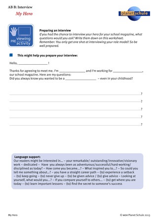 Im Anschluss überlegen die Schülerinnen und Schüler Fragen, die sie ihrem Idol stellen würden, wenn sie die Chance zu einem Treffen hätten. Diese schriftliche Aufgabe lenkt die Aufmerksamkeit der Schüler darauf, was sie im Film wohl über die Vorbilder erfahren werden. Auf Arbeitsblatt B "Interview" erhalten sie "language support" und Hilfestellungen.