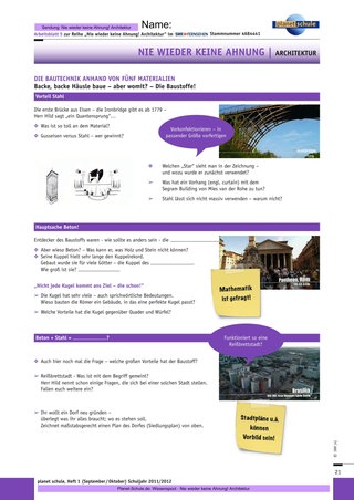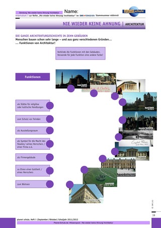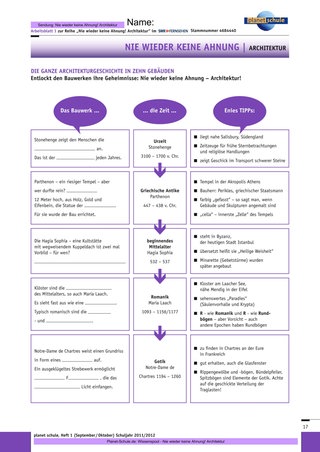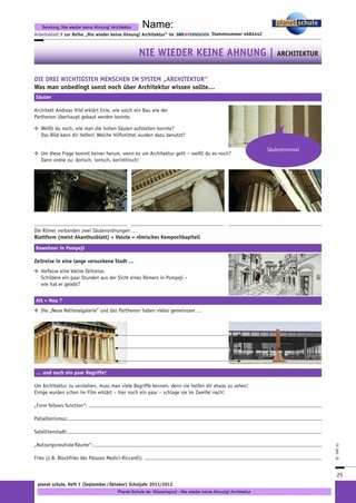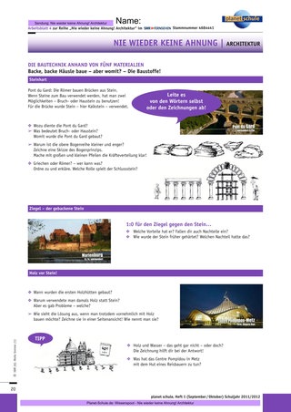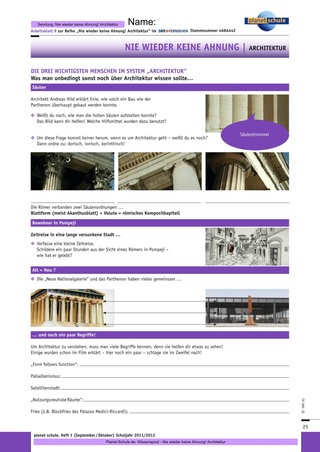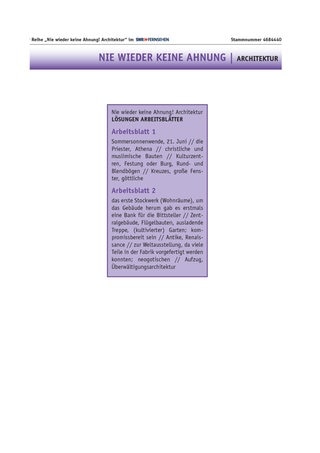 Der Einstieg mit Folge 2 eignet sich für die Sekundarstufe I. Die Baumaterialien liefern einen direkten und greifbaren Zugang zu den Bauten, erfordern dabei weniger historisches Vorwissen als Folge 1. Die Arbeitsmaterialien sind auf die jeweilige Folge zugeschnitten, ein Arbeitsblatt liefert vermischte Aufgaben zu allen drei Folgen. Gekennzeichnet werden zwei Anforderungsniveaus: