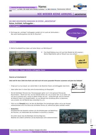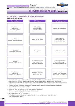 Ebenso werden dann kontrastiv Bewohner Pompejis und Menschen Anfang des 20. Jahrhunderts gegenübergestellt. Verbunden wird dies mit der Frage, wann man begann, sich wirklich Gedanken über die Wohnverhältnisse der Bürger zu machen. Die Arbeitsblätter verstehen sich zunächst als Sammlung der Erfahrungen zu den drei Personengruppen (der Architekt – Arbeitsblatt 6) – vor der Bearbeitung sollte den Lernenden jedoch schon bekannt sein, dass diese Aufgaben zur ersten Vorbereitung des Planspiels (siehe Arbeitsblätter 7 und 8) dienen. Das Planspiel ermöglicht selbsttätiges Auseinandersetzen und somit Wiederholen der Inhalte der drei Folgen. Es kann auch den Weg zu einer ästhetisch-praktischen Arbeit bereiten, ein dreidimensionales Modell zu erstellen. Hierzu gibt es in allen Folgen immer wieder Ansatzpunkte. Zudem kann es zu einem bewussten Nachdenken über die Bedürfnisse und Anforderungen an die drei Personengruppen führen, zu denen die Schülerinnen und Schüler auch einmal gehören werden oder schon gehören.
