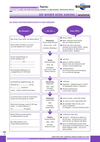 Die Sendungen stellen betont einen ersten Einstieg dar. Folge 1 kann eine Grundlage für eine anschließende vertiefende architekturhistorische Auseinandersetzung sein. Bauwerke sind sehr komplex und daher auch nicht leicht zu besprechen und einzuordnen. Es empfiehlt sich eine Unterrichtseinheit Kunstgeschichte – zum Beispiel mit den Materialien rund um „Nie wieder keine Ahnung! Malerei“ vorzuschalten. So können die Lernenden die Bauwerke mit mehr Überblick über die Epochen und das Zeitgeschehen betrachten.