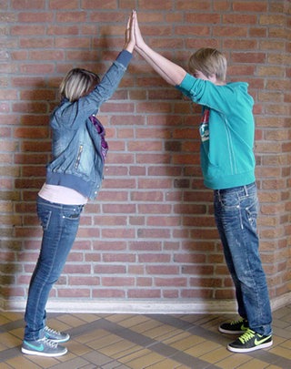 Zwei etwa gleichgroße Schüler stellen sich so gegenüber, dass ihre Hände sich mit nach oben ausgestreckten Armen berühren – sie bilden einen gotischen Spitzbogen. Lassen sie sich nun leicht gegeneinander fallen, spüren sie den Druck auf den Händen.