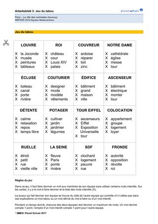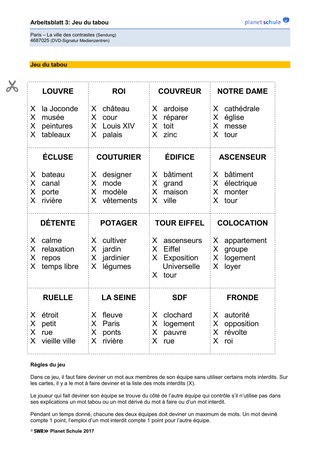 Das Spiel dient der Wiederholung und Festigung lexikalischer und inhaltlicher Aspekte des gesamten Films. Die Seite muss nach dem Kopieren zu kleinen Karten auseinandergeschnitten werden. Auf dem Arbeitsblatt findet sich auch ein stark vereinfachter Hinweis zur Durchführung, wobei die jeweiligen Mannschaften am besten aus mindestens vier Mitgliedern bestehen. Da es sich um insgesamt nur 16 zu erratende Begriffe handelt, sollte die Ratezeit für die jeweilige Gruppe nicht mehr als zwei bis maximal drei Minuten betragen, damit im ersten Durchgang nicht zu viele Begriffe offengelegt werden und für das gegnerische Team noch mindestens acht zu erratende Aufgaben übrig bleiben.