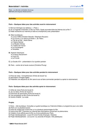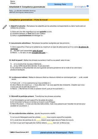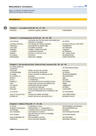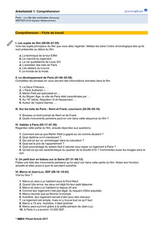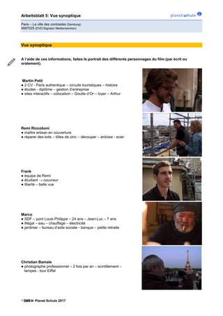Schritt 3: Die Schülerinnen und Schüler machen sich anhand des Arbeitsblatts 1 „Compréhension“ mit den genauen Aufgabenstellungen für die jeweilige Sequenz vertraut. Die Beantwortung der Fragen selbst kann eventuell arbeitsteilig durchgeführt werden und sollte am besten in Form von stichwortartigen Notizen geschehen.