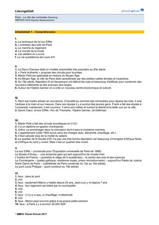 Einige der Aufgabenstellungen überprüfen vor allem das Sehverstehen (I, III,2 V, IX A, IX C, XI,4, XIII,1+4, XIV). Das Lösungsblatt (siehe ganz unten) enthält für alle Fragen / Aufgabenstellungen jeweils einen ausformulierten Vorschlag.