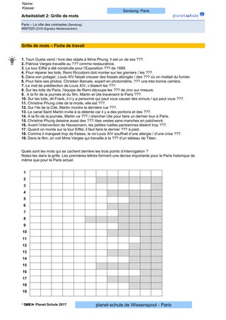 Dieses Arbeitsblatt kann erst nach der Erarbeitung des Films eingesetzt werden. In Form eines Rätsels stellt es für 19 Vokabeln den Zusammenhang mit dem Filmtext her. Die Lösungswörter, deren Anfangsbuchstaben die Devise der Stadt Paris („Fluctuat nec mergitur“) ergeben, werden in das Gitter eingetragen. In diesem Zusammenhang kann auch (zum Beispiel als Rechercheaufgabe für alle oder mit einer kurzen Schülerpräsentation) auf die terroristischen Anschläge vom November 2015 eingegangen werden, in deren Folge dieses Motto wieder tief ins Bewusstsein der Pariser Bevölkerung eingedrungen ist (siehe dazu ganz unten das Lösungsblatt).