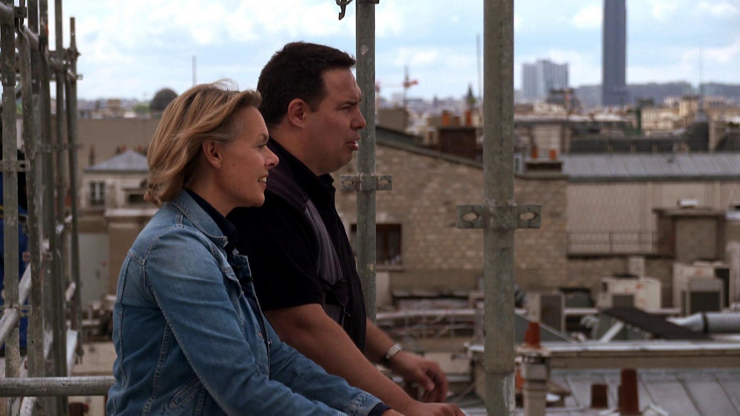 Chef-Dachdecker Remi Riccoboni erklärt das Besondere der Mansardendächer und demonstriert, wie die alten Dächer renoviert werden. Frank, einer seiner jungen Kollegen, betont die faszinierende Seite dieses Berufes.