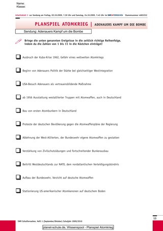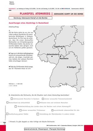 Zweite Stunde: Der Unterricht beginnt mit der Wiederholung der Chronologie hinsichtlich Adenauers Bemühen die Bundeswehr mit Atomwaffen auszurüsten. Dazu füllen die Schülerinnen und Schüler das erste Arbeitsblatt aus. Nach der Kontrolle wird der Schwer-punkt des Geschichtsunterrichts nun auf die Sinnhaftigkeit der atomaren Militärstrategie gelegt. Anhand des zweiten Arbeitsblattes soll der Klasse erneut vor Augen geführt werden, wie sich die Lage der Menschen in Deutschland nach einem atomaren Angriff und einer ebenfalls atomaren Verteidigungswelle gestaltet hätte. Daran anschließend werden die militärpolitischen Entscheidungen der Ära Adenauer infrage gestellt, indem in Kleingruppen Alternativen entwickelt und diese abschließend in der Klasse präsentiert. Die Schülerinnen und Schüler schlüpfen dabei in die Rollen westdeutscher Parlamentarier und erarbeiten eigenen Konzepte, um auf die in der Adenauer-Quelle betonten Aspekte zu reagieren.