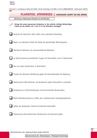 Aufgrund der Länge des Films, gegeben durch die Problematik des Themas, bietet es sich an, eine Doppelstunde für die Erarbeitung anzusetzen. Im ersten Teil sollen den Schülerinnen und Schülern vor allem Grundlagen, Intentionen, Maßnahmen und die allgemeine Zielsetzung von Adenauers Außenpolitik verdeutlicht werden. Die Originalquelle im Vergleich mit den im Film dargestellten Ereignissen ermöglicht eine umfassende inhaltliche Erarbeitung. Die zweite Geschichtsstunde soll zu einer abschließenden Bewertung der atomaren Militärstrategie durch die Klasse führen. Nachdem der Inhalt vollständig erfasst wurde, wird den Schülerinnen und Schülern durch eine Art Rollenspiel die Möglichkeit eröffnet, politische Alternativen zu erarbeiten.