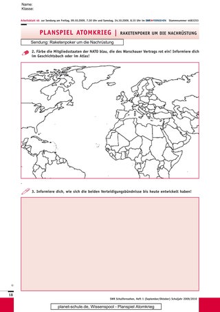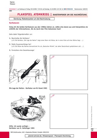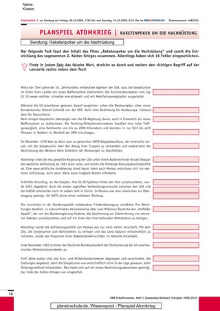 Um die Klasse auf den Inhalt des Films entsprechend vorzubereiten, wird nun mit Arbeitsblatt 3 gearbeitet. Die Ereignisse um die atomare Aufrüstung sind hier in einem Text zusammengefasst, der fehlerhaft ist und von den Schülerinnen und Schülern während oder nach dem Zeigen von „Raketenpoker um die Nachrüstung“ korrigiert wird.Nachdem der Film gezeigt wurde, bleibt noch Zeit, um den Text gemeinsam zu berichtigen, um so die fachliche Basis für die Folgestunde zu legen.