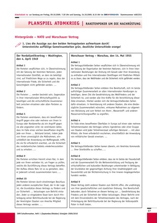 Begonnen wird mit den bekannten Schiller-Worten, die Ronald Reagan während seiner Ansprache im Deutschen Bundestag im Juni 1982 zitiert, und die später im Film wiederholt werden: „Es kann der Frömmste nicht in Frieden leben, wenn es dem Bösen Nachbarn nicht gefällt.“ Ein Klassengespräch zur Intention des Zitats wird geführt. Dabei sollte herausgearbeitet werden, welche Grundaussage hinter den Worten steckt und wer wohl mit „dem Frömmsten“, wer mit „dem bösen Nachbarn“ gemeint sei. Interessant ist sicherlich auch der Aspekt, warum sich der damalige US-Präsident bei einer Rede in Bonn ausgerechnet auf einen deutschen Dichter beruft. Eine eingeblendete oder aufgehängte Europa-Karte, die insbesondere die militärpolitische Situation während des Kalten Krieges zeigt (NATO- und Warschauer-Pakt-Staaten sind deutlich zu unterscheiden) unterstützt den Erkenntnisgewinn. Schülerinnen und Schüler äußern ihre Vorkenntnisse oder Vermutungen zu politischen Entwicklungen jener Tage.