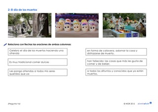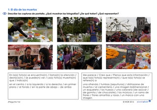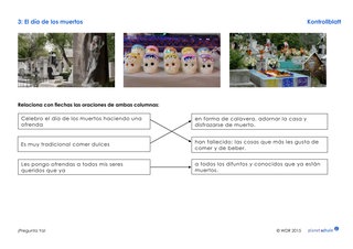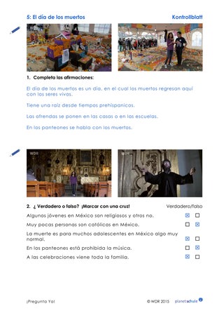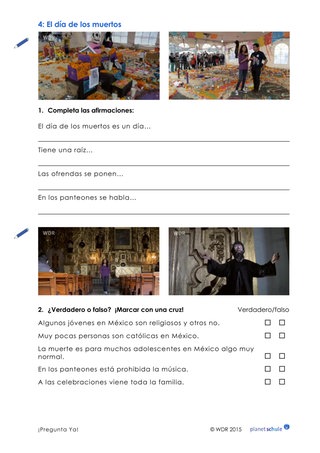 Anschließend sieht die Klasse den Filmclip noch einmal. Sie achten besonders auf die Rolle von Religiosität und Tod in mexikanischen Familien. Zu diesem Thema bearbeiten sie Arbeitsblatt 4, auf dem sie offene Fragen zu Details aus dem Film finden, sowie Aussagen, die sie durch das Hör-Seh-Verstehen als wahr oder falsch charakterisieren. Die Lösungen finden sie auf Kontrollblatt 5.