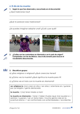 | Vertiefung | Vergleich deutscher und mexikanischer Traditionen anhand von Leitfragen, Gruppendiskussion | Einzelarbeit, Gruppenarbeit oder Think-Pair-Share | Filmclip 14 Arbeitsblatt 6 |