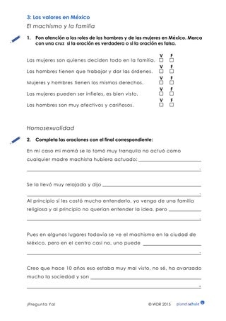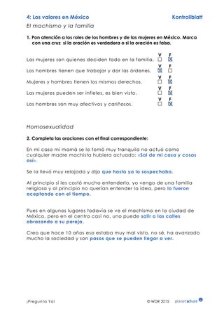 Nach einer zweiten Filmbeobachtung setzen die Schülerinnen und Schüler sich näher mit den Themen „Rollenklischees“ und „Homosexualität“ auseinander. Dazu finden sie Aussagen auf Arbeitsblatt 3, die sie als wahr oder falsch kategorisieren sollen, sowie Sätze, die sie mit ihrem Wissen aus dem Hör-Seh-Verstehen vervollständigen sollen. Ihre Ergebnisse können sie mithilfe von Kontrollblatt 4 überprüfen.