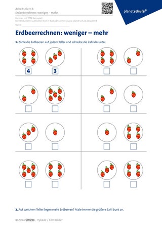 - Arbeitsblatt 2 – Erdbeerrechnen: weniger – mehr: Die Schüler:innen zählen die Erdbeeren und lernen, welche Zahlen größer oder kleiner sind.