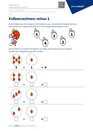 - Arbeitsblatt 1 – Erdbeerrechnen: minus 1: Die Schüler:innen verbinden die Zahlen 5-1 in der richtigen Reihenfolge, zählen die abgebildeten Erdbeeren Die Kinder subtrahieren im Zahlenraum 1-5.