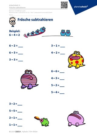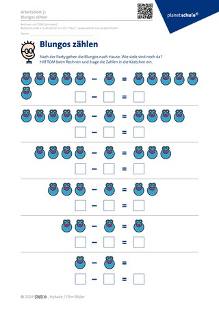- Arbeitsblatt 3 – Frösche subtrahieren: Am Beispiel der „Blungos“ aus dem Lernspiel „Rechnen mit TOM“ wird das Subtrahieren der Zahlen 1-6 geübt.