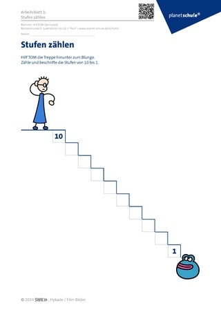 - Arbeitsblatt 1 – Stufen zählen: Die Schüler:innen zählen rückwärts von 10 runter und schreiben die Zahlen in die Stufen.