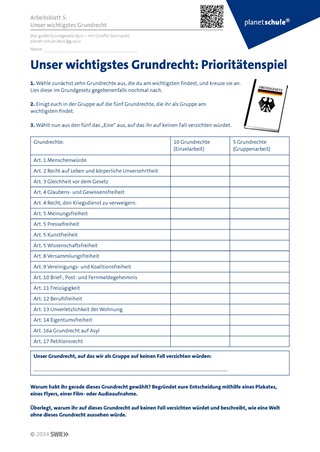 Mithilfe von Arbeitsblatt 5 “Welches Grundrecht ist dir wichtig?“ legen sich die Schüler:innen zunächst in Einzelarbeit auf 10 Grundrechte fest, die Ihnen persönlich wichtig sind. Anschließend einigen sie sich in der Gruppe zunächst auf fünf und final auf das eine Grundrecht, auf das sie als Gruppe auf keinen Fall verzichten würden. Ihre Begründung sollen sie entweder durch ein Plakat oder mithilfe eines Flyers visualisieren oder durch die Erstellung einer kurzen Film- oder Audioaufnahme. Präsentation der Ergebnisse im Plenum.