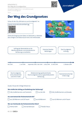 Die Schüler:innen erhalten Arbeitsblatt 2 ‚Der Weg des Grundgesetzes‘ und schauen den kurzen Clip über die Entstehung des Grundgesetzes (Filmclip ‚Wie kam es zum Grundgesetz‘). Während des Betrachtens ordnen die Schüler:innen den Ereignissen das richtige Datum auf dem Zeitstrahl zu. Weitere Fragen unterhalb des Zeitstrahles dienen der Differenzierung für stärkere Schüler:innen. Die Zuordnung wird im Plenum besprochen.