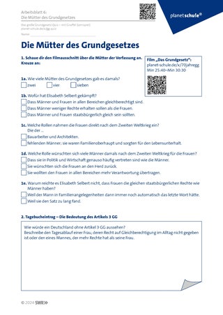 Die Schüler:innen schauen die kurze Filmsequenz (Film ‚Das Grundgesetz‘ Min 25:40 – Min 30:30) über die Mütter des Grundgesetzes und bearbeiten dazu Ankreuzaufgaben auf Arbeitsblatt 6 ‚Die Mütter des Grundgesetzes.‘ Aufgabe 2 auf dem Arbeitsblatt fordert die Schüler:innen dazu auf, einen Tagebucheintrag zu Artikel 3 GG zu schreiben.