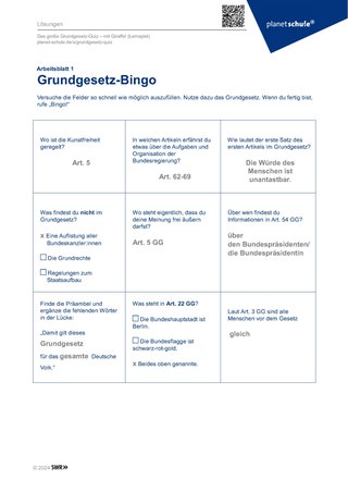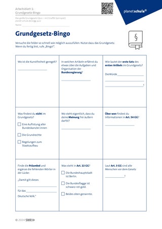 Die Schüler:innen erhalten ein Grundgesetz in gedruckter Form und Arbeitsblatt 1 ‚Grundgesetz-Bingo‘. Sie versuchen die neun Fragen mithilfe des Grundgesetzes in Einzelarbeit oder Partnerarbeit so schnell wie möglich zu beantworten. Wer zuerst alle Fragen beantwortet hat ruft ‚BINGO.‘ Sicherung der Antworten im Plenum.