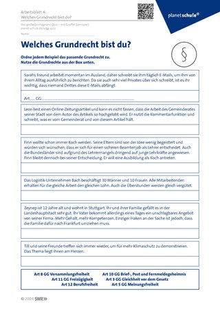 Die Schüler:innen erhalten Arbeitsblatt 4 ‚Welches Grundrecht bist du?‘ und finden in Einzel- oder Partnerarbeit zum jeweiligen Fallbeispiel das passende Grundrecht. Sicherung im Plenum. Ein Grundgesetz kann hierbei als Hilfestellung bzw. zur Differenzierung genutzt werden.