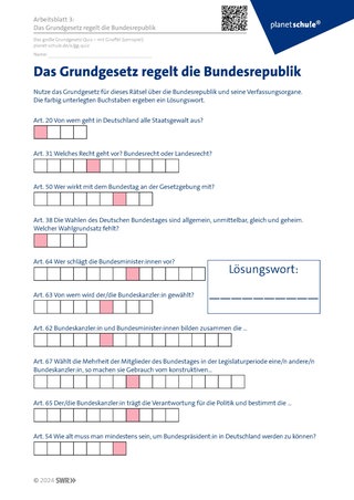 Grundgesetze in gedruckte Form sowie Arbeitsblatt 3 ‚Das Grundgesetz regelt die Bundesrepublik‘ werden ausgeteilt. Die Schüler:innen suchen in Einzel- oder Partnerarbeit nach Antworten im Grundgesetz zu den gestellten Fragen und kommen so auf das gesuchte Lösungswort. Sicherung im Plenum.