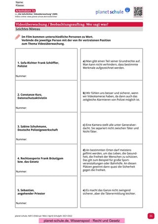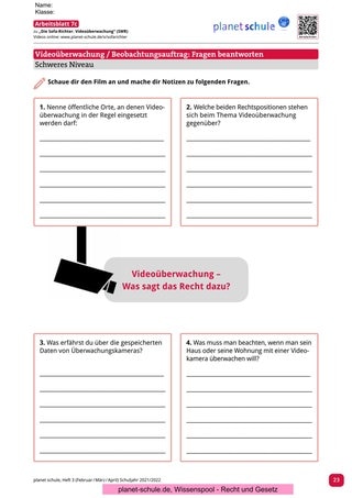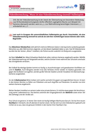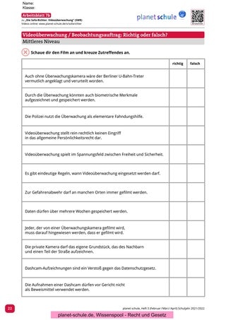 Zu diesem Film soll in der Vertiefungsphase in Partnerarbeit (alternativ ist auch eine Gruppenarbeit möglich) darauf eingegangen werden, an welchen Orten eine Videoüberwachung sinnvoll und gerechtfertigt ist. Arbeitsblatt 8 beinhaltet unterschiedliche Fälle beziehungsweise Situationen, anhand derer die Schüler*innen sich jeweils für oder gegen eine Videoüberwachung entscheiden sollen.