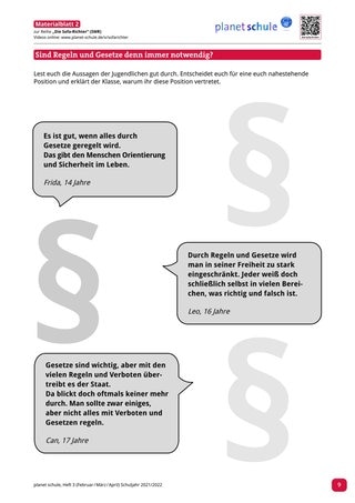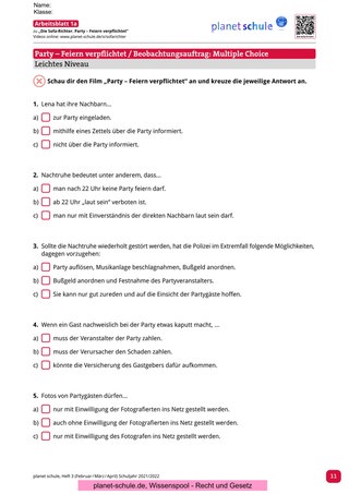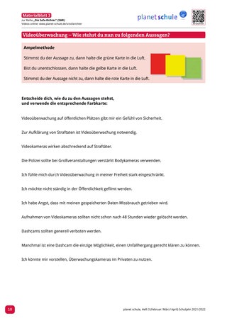 Wurden die Filme „Party – Feiern verpflichtet“ oder „Die Polit-Putze“ bearbeitet, dann bietet Materialblatt 2 einen passenden Abschluss. Die Schüler*innen sollen erläutern und begründen, wie sie zu der Aussage „Sind Regeln und Gesetze denn immer notwendig?“ stehen. Unterstützend gibt die Lehrkraft drei Äußerungen von Jugendlichen vor, an denen sich die Schüler*innen orientieren können. Zum Abschluss der Stunde mit dem Film „Videoüberwachung - Wann ist eine Videoüberwachung erlaubt, wann nicht?“ eignet sich Materialblatt 3. Unter Verwendung der Ampelmethode versucht die Lehrkraft ein finales Stimmungsbild der Klasse zur Thematik einzuholen. Wichtig hierbei ist, dass die Lehrkraft grüne, gelbe und rote Karten für jeden Schüler vorbereitet hat.