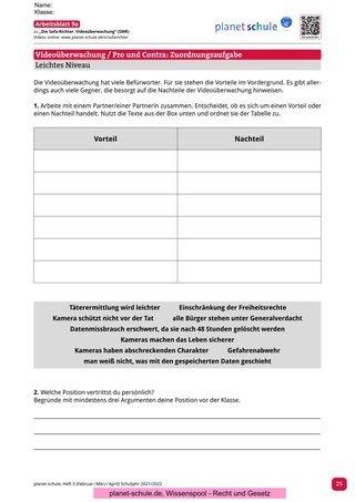 Arbeitsblatt 9a (leichtes Niveau) und. Arbeitsblatt 9b (mittleres/schweres) Niveau vertiefen nun eine kritische Auseinandersetzung mit der Thematik Videoüberwachung. Wählt man das leichte Niveau, dann ordnen die Schüler*innen vorgegebene Vor- und Nachteile der Videoüberwachung zu. Weiterhin sollen sie mithilfe der Argumente ihre eigene persönliche Meinung formulieren und begründen.