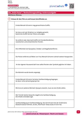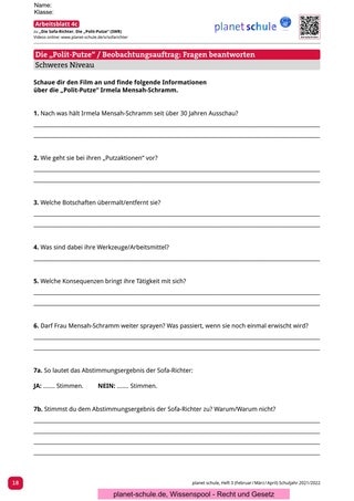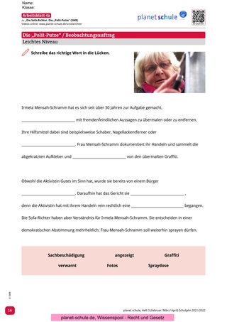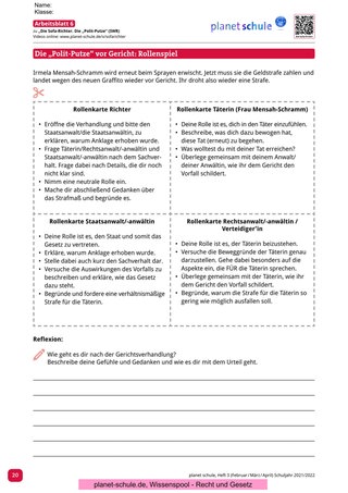 Arbeitsblatt 6 regt zum Rollenspiel „Die Polit-Putze vor Gericht“ an. Die Schüler*innen sollen verschiedene Rollen einnehmen und eine Gerichtsverhandlung simulieren. Das Rollenspiel kann jeweils in Gruppen eingeübt werden. Die Simulation sollte von einigen ausgewählten Schüler*innen im Plenum vorgestellt und anschließend von der Klasse bewertet werden. Eine anschließende Reflexion der jeweiligen Rollen durch die Protagonisten würde sich anbieten.