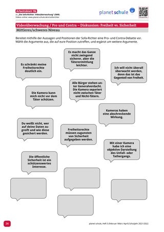 Videoüberwachung Pro und Kontra – Zuordnungsaufgabe (leichtes Niveau) Videoüberwachung Pro und Kontra-Debatte (mittleres/schweres Niveau) | Gruppenarbeit