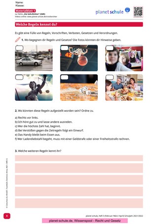 Die Lehrkraft beginnt die Unterrichtsstunde mit Materialblatt 1 und lässt die Schüler*innen zunächst überlegen, wo ihnen Regeln und Gesetze im Alltag begegnen. Möglich wäre hierbei die Anwendung der Think-Pair-Share-Methode. Danach gibt die Lehrkraft fünf Beispiele von Regeln vor. Die Schüler*innen sollen darüber nachdenken, in welchen Bereichen diese zum Einsatz kommen. Abschließend soll die Klasse weitere Regeln nennen, die sie aus diesen Bereichen kennen.
